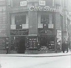The two lower floors of the building were also altered. In October 1881, the pastry-baker and wine merchant D. B. Schucani (from Ftan in Graubünden) moved his café from the ground floor of nearby Vimmelskaftet 43 to these new mezzanine with one room with windows to Vimmelskaftet where newspapers were displayed and another with windows to Badstuestræde.[19] His countrymen and olleagues Mini and à Porta from Kongens Nytorv provided a deposit for his investment. The café was given the name Café Bernina after the [[ Bernina Range]] in South-Eastern Switzerland.[13]