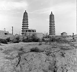 The Twin Pagodas as seen in 1948. In the front is a bunker of the Republic of China Armed Forces.