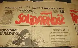 Tygodnik Solidarność ([tɨˈɡɔ.dɲik sɔ.lʲiˈdar.nɔɕt͡ɕ], "Solidarity Weekly") is the main organ of the Independent Self-Governed Trade Union "Solidarity." As an anti-Communist union paper, it is also a Polish right-wing weekly magazine. Started and published by the Solidarity movement on 3 April 1981,[1] it was banned a year later by the People's Republic of Poland following the martial law declaration from 13 December 1981 and the thaw of 1989.[2] It was legalized in June 1989 after the Polish legislative elections, 1989.[2]