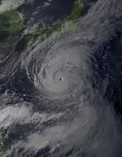 As the typhoon's center moved north, the most powerful area near its center touched coastal areas southeast of Tokyo. At 6 A.M. on September 17, the typhoon was centered almost directly over Aoga Island, 225 miles south of Tokyo, moving north-northeast at 21 miles per hour. Forecasters predicted that Tokyo would receive up to 12 inches of rain over 36 hours. Seven major train lines and subways in and around Tokyo reduced service.[3] There were no immediate reports of injuries, but wind-carried objects, such as tree branches, hurt at least 20 people and sudden wind gusts knocked people down.[5]