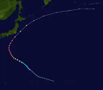 Oscar recurved northeastwards two days later, skirted past Honshū on September 17 and started weakening. Oscar was downgraded to a tropical storm, then the system became extratropical on September 18. In Japan, Oscar claimed nine lives and injured at least 13 people. Six people were reported missing and about 600 houses were damaged by high winds and flood water.[4]
