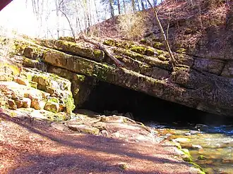Eventually, the stream connects with the nearby Arch Spring Cave, but underwater blockages and cave-ins prevent a complete trip through. The total length of the cave system, from the entrance to the exit at Arch Spring, is about 4,200-foot (1,300 m).[3]