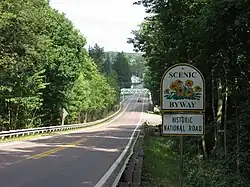 There are several historic bridges along the National Road that are still present near the current route of Alt US 40. Among them are the Casselman River bridge in Grantsville, and the bridge over Braddock Run, a tributary of Wills Creek, in Clarysville. The original National Road bridge over the Casselman River was a stone arch bridge constructed in 1813.[9] The 80-foot (24 m) span was built to be the largest bridge of its type in the United States at the time, and during its construction it was believed that the bridge could not stand on its own.[9] The bridge was constructed in this manner in the hopes that the Chesapeake and Ohio Canal would eventually pass under it, though construction on the canal was stopped at Cumberland in 1850.[19] When US 40 was first designated in 1925, it crossed the Casselman River on the original stone bridge.[9] In 1933, a new steel bridge was constructed to replace the National Road bridge, and it is this bridge that Alt US 40 now follows.[9] The original bridge was declared a National Historic Landmark in 1964,[20] and is now part of the Casselman River Bridge State Park.[9]