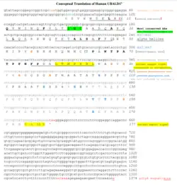 The protein encoded by UBALD1 isoform 1 has a predicted isoelectric point of 6.13 and a molecular weight 19.0 kDa.[6][7] UBALD1 composition is rich in alanine and proline, and contains multiple duplets/triplets of these residues. Proline residues and multiplets are highly conserved, specifically within the PHA03247 domain. The protein contains one domain, PHA03247, or large tegument protein UL36 domain. Tegument protein UL36 is the largest tegument protein found in herpes simplex virus 1, and contains deubiquitinating activity.[8]