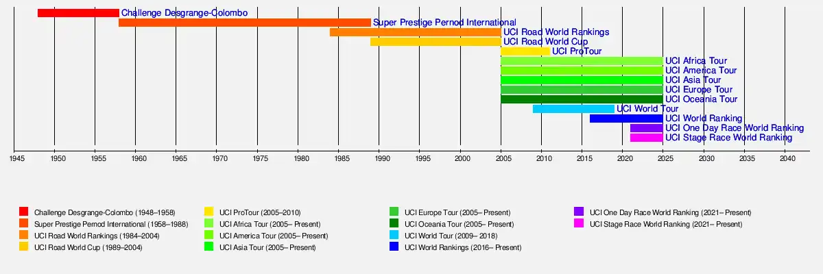 Cycling's first season-long classification system was the Challenge Desgrange-Colombo, named after the Tour de France and Giro d'Italia directors at the time.[2] Introduced in 1948, the rankings included the Giro d'Italia, Tour de France, Vuelta a España, Milan–San Remo, Tour of Flanders, Paris–Roubaix, Liège–Bastogne–Liège, Lombardia, Paris–Tours, Paris–Brussels and Tour de Suisse.