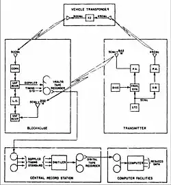 The ground stations simultaneously receive the 50 MHz reference signal and the 900 MHz transponder signal. The 50 MHz signal is multiplied by 18 and compared to the 900 MHz signal. The difference will be zero for a vehicle on the pad and there will be a Doppler effect (measured in cycles per second) if the vehicle is in motion. This effect will be proportional to a loop velocity with amount depending on the location of the transmitter site, receiver sites, as well as vehicle position and velocity.