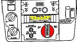 Rudder trim control (in red) and rudder trim position indicator (in yellow), on the rear of the center console, between the pilot seats of the B737-400. Note that the indicator needle is in the center of the gauge—the required position when pilots finish running the pre-start and pre-takeoff checklists