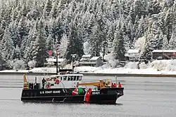 Elderberry is one of two 65-foot inland buoy tenders operated by the Coast Guard. She was designed by naval architect H. C. Hanson, and built by Reliable Welding Works in Olympia, Washington. Her keel was laid in October 1953.[1] She was launched on June 2, 1954, and christened by Miss Claire Dick, whose father, Captain G. W. Dick was chief of the engineering division of the 17th Coast Guard District.[2] Elderberry was commissioned in Olympia on June 28, 1954. She and her sister ship USCGC Bayberry, which was commissioned on the same day, are the third and fourth oldest cutters in the Coast Guard's fleet.[3]