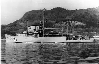 Due to the cessation of hostilities, YDG-11 saw little or no active service before being berthed with the Pacific Reserve Fleet at San Diego, California. She was retained on an inactive, in service, status until the winter of 1946 and 1947, when she was placed out of service, in reserve. On 1 November 1947 she was re-designated ADG-11. The ship remained inactive until July 1951, when she was again placed in service. Assigned to the Far East, ADG-11 was based at Yokosuka, Japan until sometime in 1954. After that, her home port was Sasebo, Japan. On 1 February 1955, she was renamed Ampere. The ship was placed out of service in February 1957. Her equipment was transferred to USS Surfbird, a minesweeping vessel which was redesignated a degaussing ship on 15 June 1957. She remained in reserve in the Far East until the summer of 1961, when the decision was made to dispose of her. Her name was struck from the Naval Register on 1 July 1961, and she was sold on 21 June 1962, to the Philippine President Lines of Manila.[2] Her final disposition is unknown.[1]