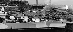 Atlanta served in the defensive screen for the task force's aircraft carriers, which operated off Okinawa from 22 to 27 May; the carriers repeatedly struck Japanese positions in the area to prepare for the imminent invasion of Okinawa.[4] While cruising at sea on 5 June, the fleet was struck by a major typhoon that damaged most of the ships, including Atlanta.[5] Atlanta was detached on 13 June and sent to San Pedro Bay in the Philippines for periodic maintenance. She arrived there the following day, and the work lasted through the end of the month. She got underway on 1 July to rejoin the task force, which had by that time passed to 3rd Fleet and had been re-numbered as Task Force 38.[4] Atlanta was assigned to the subordinate unit, Task Group 38.1, once again serving in the screen for the carriers. At that time, the unit consisted five carriers, three fast battleships, four other cruisers, and several destroyers.[6] The carriers conducted a series of strikes on the Japanese Home Islands over the following weeks, and Atlanta took part in several shore bombardments during this period.[4]