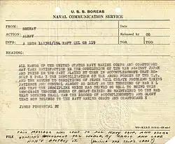 Telegram from Secretary of the Navy James Forrestal announcing the surrender of Japan.
