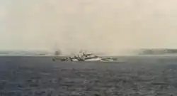 On the morning of 7 December 1941, California was moored on the southeastern side of Ford Island, the southernmost ship along Battleship Row. At the time, the ship had two of her 5-inch guns and two of her .50-cal. machine guns designated as ready guns, with fifty 5-inch shells and four hundred .50-cal. rounds at the guns. Immediately after the Japanese attack on Pearl Harbor began, California's first lieutenant, Lieutenant Commander Marion Little, who was the senior officer aboard the ship at the time, issued the order to general quarters. Little ordered the guns into action and prepared to get the ship underway. At 08:03, the crews of the ready guns began to engage the Japanese aircraft, which included Mitsubishi A6M Zero fighters that strafed the ship. The gunners quickly expended the ready ammunition, however, and the magazines had to be unlocked before they could be resupplied. While this effort was going on, a pair of Nakajima B5N torpedo bombers approached and dropped their torpedoes toward California. Both hit the ship at 08:05, one forward and the other further aft. The former detonated below the armor belt at frame 52 (between number 2 turret and the bridge), creating a hole 10 feet (3 m) high and 24 feet (7.3 m) long, destructively deforming the first torpedo bulkhead and transverse stiffeners between frames 47 and 60, and holing the second bulkhead with fragments. The latter tore a hole that was 40 feet (12 m) long below the belt armor.[5][7] The interior torpedo bulkheads nevertheless held and helped to contain the flooding.[8]