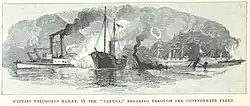 Cayuga also joined in the engagement with Forts Jackson and St. Philip below New Orleans, Louisiana in April 1862, which led to the fall of the city to Flag Officer David Farragut. Three of Cayuga's sailors were awarded the Medal of Honor for their actions during this battle: Captain of the Afterguard William Parker, Quartermaster Edward Wright, and Boatswain's Mate William Young.[1][2] The ship then bombarded Donaldsonville, Louisiana, on 9 August 1862. On 18 April 1863, at Sabine Pass, Texas, her commanding officer, Lieutenant Commander David McDermut, led a party of men ashore in a reconnaissance designed as the last step in a plan to cut out Confederate steamers lying at Sabine, then to establish control of the Sabine River, separating southern forces in Texas from those in Louisiana. The party was surprised by Confederate soldiers; McDermut was mortally wounded and six men were taken prisoner.