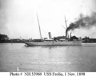 Frolic was built for H. M. Hanna in 1892 by Globe Iron Works at Cleveland, Ohio, yard number 46, as the private yacht Comanche, official number 126888.[2] The U.S. Navy purchased her on 28 May 1898 for service during the Spanish–American War and commissioned her as USS Frolic on 6 July 1898.