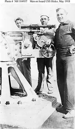 Sailors pose with a gun aboard USS Hisko sometime between 3 and 18 May 1918 during a voyage from New York City to Plymouth, England.