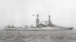 USS Idaho (BB-42), a New Mexico-class battleship, was the fourth ship of the United States Navy to be named for the 43rd state. She was the third of three ships of her class. Built by the New York Shipbuilding Corporation of Camden, New Jersey, she was launched in June 1917 and commissioned in March 1919. She was armed with a battery of twelve 14-inch (356 mm) guns in four three-gun turrets, and was protected by heavy armor plate, with her main belt armor being 13.5 inches (343 mm) thick.