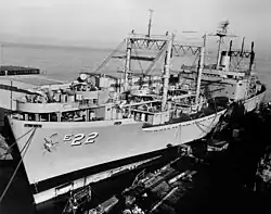 USS Mauna Kea (AE-22) was a Suribachi-class ammunition ship of the United States Navy that was laid down at the Bethlehem-Sparrows Point Shipyard Inc., Sparrows Point, Maryland, on 6 May 1955; launched on 3 May 1956; sponsored by Mrs. Charles R. Brown; and commissioned on 30 March 1957, Captain Kenneth Loveland in command. The ship was decommissioned 30 June 1995 with over 38 years of active service. Mauna Kea was the oldest active ship in the Navy for a single week (USS Jason having been decommissioned on June 24) prior to being decommissioned.