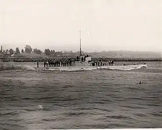 The later O-boats (O-11 through O-16) were designed by Lake Torpedo Boat Company to different specifications from the earlier ones designed by Electric Boat. They did not perform as well, and are sometimes considered a separate class.[1] The submarines had a length of 175 feet 3 inches (53.4 m) overall, a beam of 16 feet 9 inches (5.1 m) and a mean draft of 13 feet 9 inches (4.2 m). They displaced 491 long tons (499 t) on the surface and 566 long tons (575 t) submerged. The O-class submarines had a crew of 29 officers and enlisted men. They had a diving depth of 200 feet (61.0 m).[2]