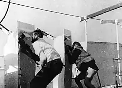At 2pm, facing irreparable damage and grievous injuries amongst the crew, Lieutenant Arthur Anders gave the order to abandon ship, and evacuated the crew and civilians onto two motorboats, the vast majority of them wounded.[10] Planes also machine-gunned these small boats taking the wounded ashore, and several more survivors were wounded. According to Lieutenant J.W. Geist, an officer aboard Panay, "the day before we told the Japanese army in the area who we were," and three U.S. flags were plainly visible on the ship. The Times correspondent Colin MacDonald, who had also been aboard Panay, saw a Japanese army small boat machine-gun the Panay as it was sinking in spite of the American flag painted on the side of the ship. Since Japanese planes continued to circle overhead, survivors cowered knee deep in mud in a swamp.[11]