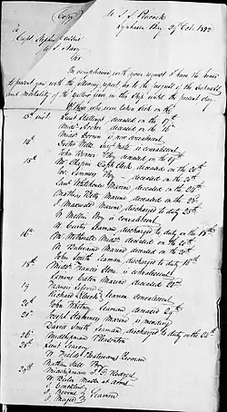 Cases of "malignant fever" were reported among crew members of Peacock in September 1822, which eventually necessitated a recess from anti-piracy activities. The Peacock pulled into Norfolk, Virginia, on 28 November 1822. The frigate USS Macedonian had recently lost 74 crew members to the disease before returning to Norfolk.[16] The symptoms per Dr. Travett included bleeding in the mouth, nose, eyes, and the gastrointestinal tract. This caused vomit containing blood, hence the Spanish name for the disease, "vómito negro", "black vomit". On 31 October 1822, Captain Stephen Cassin wrote to Secretary of the Navy, Smith Thompson, confirming the yellow fever outbreak on the Peacock.[17]