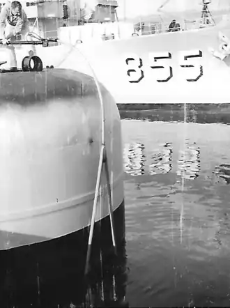 As helicopters proved more capable for rescue work after World War II, eight surviving rescue escort patrol craft were given other assignments. PCE(R)-855 was assigned to the Navy Electronics Laboratory at San Diego on 15 February 1946. On 7 June 1946 she was redesignated EPCER-855 and underwent alterations at Long Beach Naval Shipyard that enhanced her suitability for service as a laboratory research ship.[2] Aft armament was replaced by a large cargo boom for towing instruments such as a thermistor chain to determine ocean temperature and salinity gradients from the surface to a depth of 800 ft (240 m).[1]