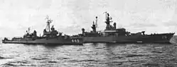 In September 1978, after an overhaul at the Charleston Naval Shipyard, Richmond K. Turner reported to Fleet Training Center, Guantanamo Bay, Cuba (GTMO) for Refresher Training (REFTRA). The day after arrival Richmond K. Turner was directed to intercept and conduct surveillance of Soviet Naval units operating in the West Indies. With that task completed, the ship was then directed to transit the Panama Canal and conduct surveillance operations off the west coast of Nicaragua.[2] Embarking REFTRA instructors, Richmond K. Turner completed all her training requirements while deployed in an operational status. The ship received the Meritorious Unit Commendation for these operations in March 1979.[3] From March to September 1979, conducted fleet and independent operations with the Sixth Fleet, Richmond K. Turner made port visits to Barcelona, Palma de Mallorca, and Valencia, Spain; Civitavecchia (Rome) and Alassio, Italy; Athens, Greece; and Constanta, Romania on the Black Sea. "Turner" was selected to represent the United States in St. Tropez at the 35th Anniversary of the Allied landings in southern France. In July 1979, "Turner" successfully launched a Harpoon missile in the Gulf of Sidra, destroying the target ship at a range of 78 miles (126 km). This was the first firing of a Harpoon missile from a deployed US Navy ship.
