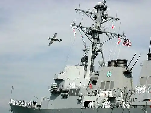Winston S. Churchill is the only U.S. Navy vessel to have a Royal Navy exchange officer permanently assigned to the ship's company (usually a Navigation Officer).[1] The U.S. Navy had a permanent U.S. Navy Officer on the Royal Navy ship HMS Marlborough until her decommissioning on 8 July 2005. Winston S. Churchill is also the only U.S. Naval vessel to fly a foreign ensign. Being named after a Briton, the Royal Navy's White Ensign is honorarily flown on special occasions from the ship's mast, on the port side, whereas the U.S. flag is flown from the starboard side. However, during normal operations, only the U.S. flag is flown on the center of the main mast.[2]