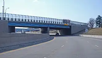 Of the two bridges, the span over I-94 is the longer. The shorter span over the westbound I-94 ramp is 50 feet (15 m) long and 90 feet (27 m) wide. The bridge has eighteen stringers, more closely spaced in the center of the deck to support what once was a streetcar line. Channels are laid over and riveted onto the stringers. The railing, installed in 1967, has a precast base and horizontal pipe.[3]