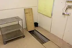 The austere brick building was designed with reinforced brick walls and concrete lintels that could withstand a bomb blast. Internally, the building was divided into two sections by a brick firewall with metal door, in anticipation of an attack. The equipment room with wide entrance door was situated at the eastern end of the building. The western part of the building held the kitchen, lavatory, bedroom and office and a further communications equipment room. Cables ran underneath the building, and in the eastern Equipment Room they ran within cable cavities in the concrete slab, accessed by a series of trapdoors. The small generator shed located to the east of the receiver station building held a Cummins diesel generator to be used if the main power supply was lost. The entrance to the facility was via a long access road from Old Cleveland Road (known asOld Cleveland Road East in 2020) where a guardhouse and gate was situated (no longer extant). The 630-metre (2,070 ft)-long access road ensured the facility was isolated and could only be accessed by authorised personnel.[30][31][32] [1]