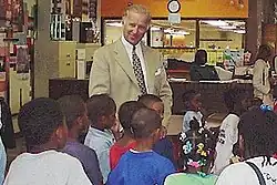 Following this, some Delaware residents met at the Krebs School in Newport to protest integration. Biden spoke to the auditorium and said his position on school busing was evolving, emphasizing that busing in Delaware was in his opinion beyond court restrictions. The crowd was unconvinced, and heckled him until he yielded the microphone.[49] This, along with the prospect of a busing plan in Wilmington, led Biden to align himself with civil rights opponent Senator Jesse Helms (R-NC) in opposing busing. Biden and anti-busing senators wanted to limit the scope of Title VI of the Civil Rights Act of 1964 with respect to the federal government's power to enforce school integration policies.[46] After 1975, Biden took a harsher line on further legislative action to limit busing.[2] That year, Helms proposed an anti-integration amendment to an education bill that would stop the Department of Health, Education, and Welfare (HEW) from collecting data about students' or teachers' races and thereby prevent it from defunding districts that refused to integrate. Biden supported this amendment, saying: "I am sure it comes as a surprise to some of my colleagues ... that a senator with a voting record such as mine stands up and supports" it.[50] He said busing was a "bankrupt idea [that violated] the cardinal rule of common sense", and that his opposition would make it easier for other liberals to follow suit.[2] But he had also supported integrationist Senator Edward Brooke's (R-MA) initiatives on housing, job opportunities and voting rights.[48] Civil rights lawyer and NAACP Legal Defense Fund director Jack Greenberg criticized Biden's support for the bill, saying it "heave[d] a brick through the window of school integration", with Biden's hand on the brick.[51]