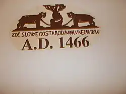 The house was named after later owner Jan Nedwídek, who in 1466 founded a brewery, continuously producing beer until 1898. On the stone portal of the house is preserved the house sign: two black bears, and between them the inscription Zde slowe od starodawna u Nedwidku, with the year 1614, when the house was rebuilt into Renaissance style.[3] After 1898, the owners were no longer able to compete with the emerging industrial breweries and therefore closed their small breweries and founded a municipal Brewery in Holešovice.