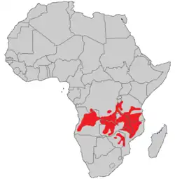 It occurs in the miombo woodlands of Angola, the DRCongo, Zambia, southern Burundi, Tanzania, Malawi, central and northern Mozambique, and Zimbabwe.[2]