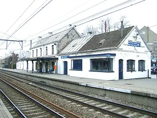 Uccle-Calevoet railway station (French: Gare d'Uccle-Calevoet [ɡaʁ dykl kalvut]) or Ukkel-Kalevoet railway station (Dutch: Station Ukkel-Kalevoet [staːˈɕɔn ˈʏkəl ˈkaːləˌvut])[a] is a railway station in the municipality of Uccle in Brussels, Belgium. The station is operated by the National Railway Company of Belgium (NMBS/SNCB) and located on line 124, between Uccle-Stalle and Linkebeek railway stations.[1] It is named after the Calevoet/Kalevoet neighbourhood in Uccle.
