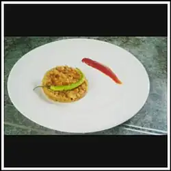 The ubiquitous Indian dish dosa has its origins in Udupi, according to P. Thankappan Nair.[5] Saaru, a spicy pepper water, is another essential part of the menu, and so are jackfruit, colocasia leaves, raw green bananas, mango pickle, red chillies, and salt. Adyes (dumplings), ajadinas (dry curries or stir fry curries), and chutneys, including one made of the skin of the ridge gourd, are specialities.[6]
