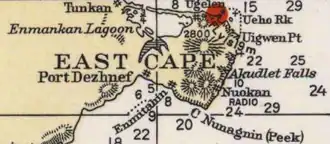 - ^ Russian: Уэлéн; Chukchi: Увэлен, Uvèlèn; Siberian Yupik: Улыӄ, Ulyḳ; Naukan Yupik: Олыӄ, Oleq;[9] Iñupiaq: Ualeq[10]; also known as Whalen in older English-language sources and Ugelen on United States Coast and Geodetic Survey charts