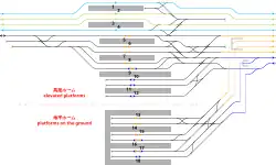 The station has two main levels of tracks and underground platforms for the Tōhoku Shinkansen tracks. Through tracks 1 to 4 on two island platforms on the main level are used by Yamanote Line and Keihin-Tohoku Line trains. Tracks 5 to 9 on two island platforms and one side of a terminal platform lead to the Ueno-Tokyo Line to Tokyo Station and beyond on the Tōkaidō Main Line. Tracks 10 to 12 terminate inside the building, and below these on a lower deck are further terminal tracks 13 to 17 (Track No.18 has been removed). Two subterranean island platforms serve Shinkansen tracks 19 to 22.