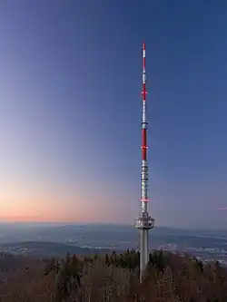 Uetliberg TV Tower is a 186.7-metre-high (613 ft) freestanding concrete TV tower on Uetliberg, near Zürich, Switzerland, built in 1990. The tower is used for radio and TV transmission. It is owned by Swisscom and generally not accessible to the public.