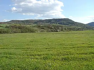 Úhošť is located in the Doupov Mountains in the municipal territory of Kadaň, between the villages Brodce and Pokutice (parts of Kadaň). The hill is a mesa with an area of 114.5 ha (283 acres); the plateau at the top has an area of 80.5 ha (199 acres).[2] It has been protected as a national nature reserve since 1974. The national nature reserve has an area of 344.9 ha (852 acres) and a negligible area of the reserve lies also in the territory of Klášterec nad Ohří.[1]