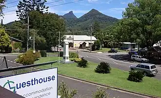 ![]() ANZAC Memorial and village. Historic "Sweetnam's Humpy" is visible in the mid-distance and Mt Warning is visible in the background. | |