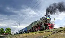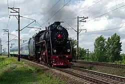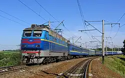 Railways in Ukraine use various gauge types. The broad gauge (1,520 mm), a legacy of Imperial Russian and Soviet times, dominates the landscape, and narrow-gauge railways (750 mm) also exist, but plans are being made to construct, restore or switch to more standard-gauge railways (1,435 mm) for better train connections with the rest of Europe.[19] About half of railways in Ukraine are electrified (some of which have been damaged during the ongoing Russo-Ukrainian War and temporarily switched to diesel trains).[20]