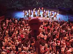 Audience participation during UOGB's performance at the Proms concerts at the Royal Albert Hall on 19 July 2009. Hinchliffe at the time announced from the stage: "a fragment of Beethoven for 1,008 ukuleles".[21]