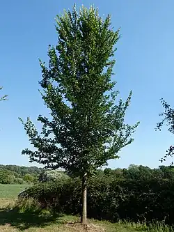 The location of the parent tree is not known but has been wrongly assumed to be in or near the eponymous town in the province of Valencia. 'Ademuz' has been widely planted in England since 2014, notably thriving at five sites in Hampshire, as part of Butterfly Conservation's elm trials, where the rainfall is approximately double the Madrid total, and geology ranges from chalk to impermeable clays. 'Ademuz' has proven particularly resilient where exposed to sea winds, notably where grown on Horsea Island in Portsmouth Harbour, Hampshire.[2] The tree was also selected for planting in the grounds of Highgrove House.[4] Among urban plantings in the UK are three specimens, planted in 2016, at the east end of Broad Walk, Christ Church Meadow, Oxford.[5][6]