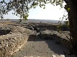 Geophysical research made by archaeologists has shown that there are more than 120 hectares worth of objects within the territory of the ancient town.[10] There are two fortified parts of the city, with the first one consisting of an area of 35.5 hectares, and the second one, discovered in 2022, being about 19 hectares.[13] To the north of the first area, there is a cemetery with a church built on top of it, known as the Northern Necropolis or Memoria. To the east of the city, there is a castrum, and to the northwest and south, there are two more necropolises, neither of which have been unearthed so far.[10]