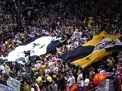 Ultras are a type of ice hockey fans mainly in European ice hockey culture who are known for their fanatical support of a club. The term originated in Italy and comes from the Latin word ultra, meaning "beyond" or "farther", but is used worldwide to describe predominantly organised fans of sports clubs. Ultras fans in ice hockey are known for organised chants, tifo choreographies, flags and sometimes flares.[1][2][3]