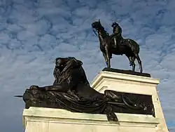 The Ulysses S. Grant Memorial is a presidential memorial in Washington, D.C., honoring American Civil War general and 18th president of the United States, Ulysses S. Grant. It sits at the base of Capitol Hill (Union Square, the Mall, 1st Street NW/SW, between Pennsylvania Avenue and Maryland Avenue), below the west front of the United States Capitol.[3] Its central sculpture of Grant on horseback faces west, overlooking the Capitol Reflecting Pool and facing toward the Lincoln Memorial, which honors Grant's wartime president, Abraham Lincoln. Grant's statue is raised on a pedestal decorated with bronze reliefs of the infantry; flanking pedestals hold statues of protective lions and bronze representations of the Union cavalry and artillery. The whole is connected with marble covered platforms, balustrades, and stairs. The Grant and Lincoln memorials define the eastern and western ends, respectively, of the National Mall.