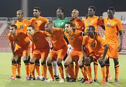 Members of the Umm Salal football team form a huddle prior to the start of their Qatar Stars League match in Doha
