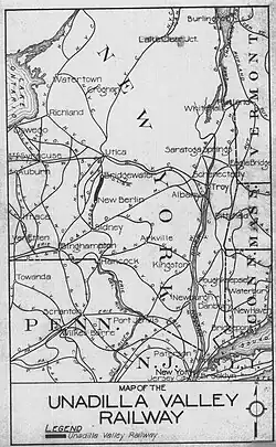 1. ^ "Unadilla Valley Railway Company Purchase | Finance Docket No. 13393" (Document). Interstate Commerce Commission. 1941-10-03. Purchase by the Unadilla Valley Railway of the New Berlin Branch of the New York, Ontario & Western Railway Company
