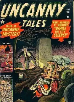 The first volume of the science-fiction / horror comic Uncanny Tales ran 56 issues, beginning publication with cover-date June 1952 and ceasing publication with its September 1957 issue. The first 28 issues predated the Comics Code Authority, the comics industry's self-censorship bureau. The series came under the Code's aegis with #29 (Feb. 1955). Published by Atlas Comics, the 1950s precursor of Marvel Comics, it was edited by the company's chief writer, Stan Lee, and included such art contributors as Bill Everett, Russ Heath, Fred Kida, Bernard Krigstein, Joe Maneely, Jerry Robinson, Syd Shores, Angelo Torres, and Doug Wildey.[1]