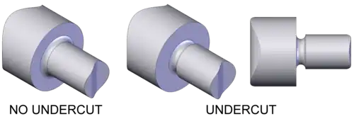 On turned parts an undercut is also known as a neck or "relief groove". They are often used at the end of the threaded portion of a shaft or screw to provide clearance for the cutting tool.