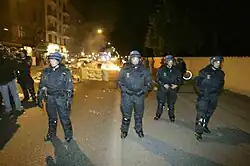 The operation had an international scale, and has even been qualified by Le Monde diplomatique as "a 'laboratory experience' in police repression." Twenty Swedish police vehicles were brought over from Malmö, and five senior Swedish police officials invited for observation.[9] Witnesses have claimed that plainclothes police agents, wearing earphones, circulated in the scene of the riots, speaking foreign languages (German, French and English).[9] Asked by a Danish newspaper, the Copenhagen's police's spokesman denied the presence of active units from others countries. However, he recognized that, "if there had been" some, it was "in quality of observers".[9] Other analysts noticed that the same tactics used by the French police during the 2006 students' protests against the First Employment Contract (CPE) had been used: special units of undercover agents moving around the demonstrators, and suddenly grabbing those who seemed to be the leaders.[9] Since the Internet had been used by the demonstrators to coordinate their movements, hour by hour, informing about the police's whereabouts, a new priority of the police forces, according to Le Monde diplomatique, was to pirate this information.[9]